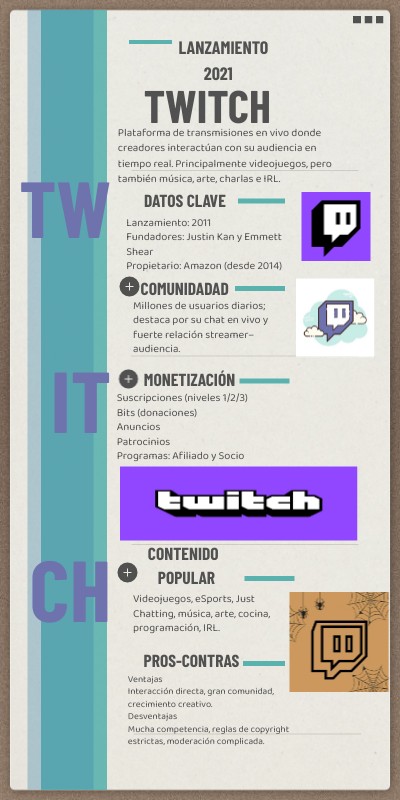 Plataforma de transmisiones en vivo donde creadores interactúan con su audiencia en tiempo real. Principalmente videojuegos, pero también música, arte, charlas e IRL.