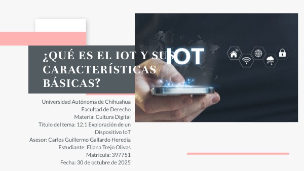 Universidad Autónoma de Chihuahua Facultad de Derecho Materia: Cultura Digital Título del tema: 12.1 Exploración de un Dispositivo IoT Asesor: Carlos Guillermo Gallardo Heredia Estudiante: Eliana Trejo Olivas Matrícula: 397751 Fecha: 30 de octubre de 2025