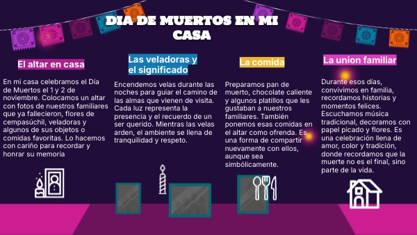 En mi casa celebramos el Día de Muertos el 1 y 2 de noviembre. Colocamos un altar con fotos de nuestros familiares que ya fallecieron, flores de cempasúchil, veladoras y algunos de sus objetos o comidas favoritas. Lo hacemos con cariño para recordar y honrar su memoria
