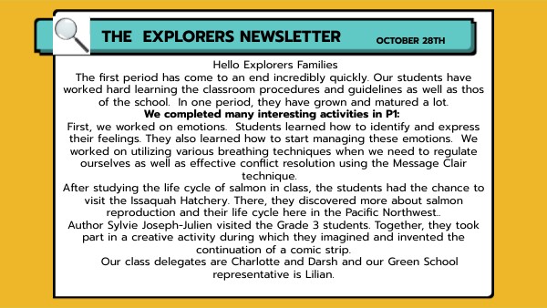 Hello Explorers Families The first period has come to an end incredibly quickly. Our students have worked hard learning the classroom procedures and guidelines as well as thos of the school. In one period, they have grown and matured a lot. We completed many interesting activities in P1: First, we worked on emotions. Students learned how to identify and express their feelings. They also learned how to start managing these emotions. We worked on utilizing various breathing techniques when we need to regulate ourselves as well as effective conflict resolution using the Message Clair technique. After studying the life cycle of salmon in class, the students had the chance to visit the Issaquah Hatchery. There, they discovered more about salmon reproduction and their life cycle here in the Pacific Northwest.. Author Sylvie Joseph-Julien visited the Grade 3 students. Together, they took part in a creative activity during which they imagined and invented the continuation of a comic strip. Our class delegates are Charlotte and Darsh and our Green School representative is Lilian.