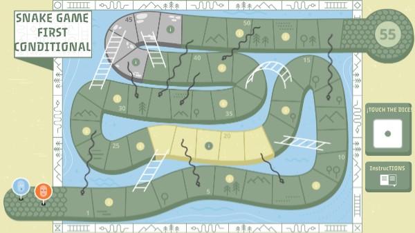 The goal of this game is to practice the First Conditional while having fun!Players take turns rolling the dice and moving their token along the board. If you land on a ladder, go up! 🪜 If you land on a snake, slide down! 🐍 Answer the question or complete the sentence correctly to stay on your square. If your answer is wrong, move back one space! The first player to reach the final square wins! 🏆