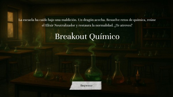 La escuela ha caído bajo una maldición. Un dragón acecha. Resuelve retos de química, reúne el Elixir Neutralizador y restaura la normalidad. ¿Te atreves?
