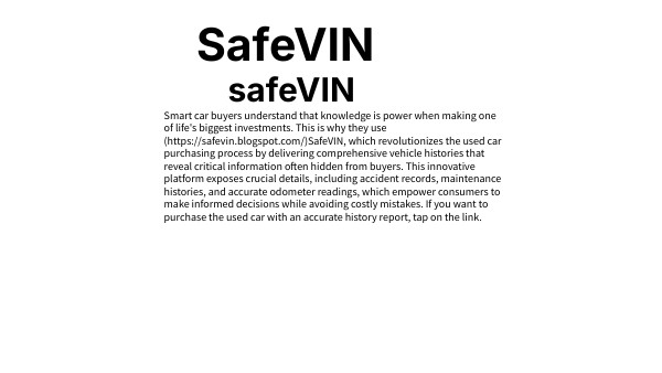 Smart car buyers understand that knowledge is power when making one of life's biggest investments. This is why they use (https://safevin.blogspot.com/)SafeVIN, which revolutionizes the used car purchasing process by delivering comprehensive vehicle histories that reveal critical information often hidden from buyers. This innovative platform exposes crucial details, including accident records, maintenance histories, and accurate odometer readings, which empower consumers to make informed decisions while avoiding costly mistakes. If you want to purchase the used car with an accurate history report, tap on the link.
