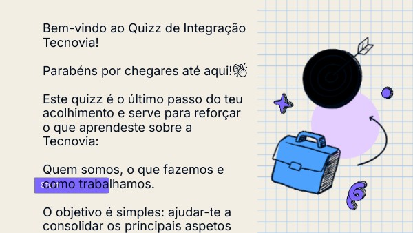 Bem-vindo ao Quizz de Integração Tecnovia! Parabéns por chegares até aqui!👏 Este quizz é o último passo do teu acolhimento e serve para reforçar o que aprendeste sobre a Tecnovia: Quem somos, o que fazemos e como trabalhamos. O objetivo é simples: ajudar-te a consolidar os principais aspetos da nossa cultura, valores e práticas, de forma leve e interativa. Não é um teste, é um momento de aprendizagem! Responde com atenção, aprende com o feedback e diverte-te a descobrir o que já faz de ti um verdadeiro membro da família Tecnovia. Boa sorte — e bem-vindo à construção do futuro connosco!