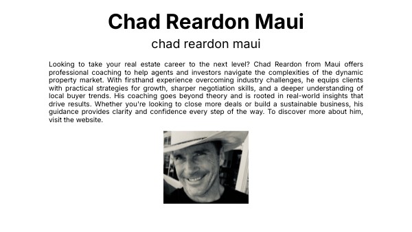 Looking to take your real estate career to the next level? Chad Reardon from Maui offers professional coaching to help agents and investors navigate the complexities of the dynamic property market. With firsthand experience overcoming industry challenges, he equips clients with practical strategies for growth, sharper negotiation skills, and a deeper understanding of local buyer trends. His coaching goes beyond theory and is rooted in real-world insights that drive results. Whether you're looking to close more deals or build a sustainable business, his guidance provides clarity and confidence every step of the way. To discover more about him, visit the website.