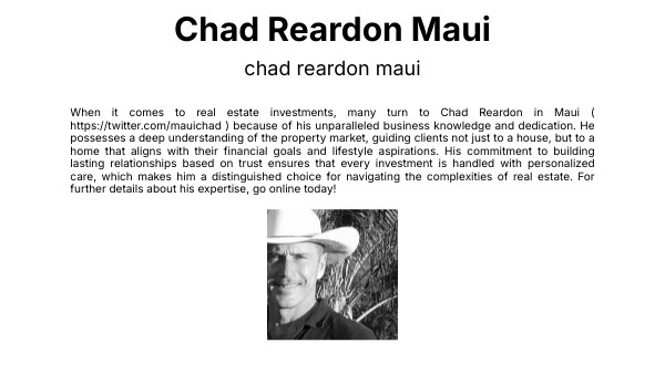 When it comes to real estate investments, many turn to Chad Reardon in Maui ( https://twitter.com/mauichad ) because of his unparalleled business knowledge and dedication. He possesses a deep understanding of the property market, guiding clients not just to a house, but to a home that aligns with their financial goals and lifestyle aspirations. His commitment to building lasting relationships based on trust ensures that every investment is handled with personalized care, which makes him a distinguished choice for navigating the complexities of real estate. For further details about his expertise, go online today!