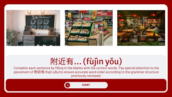 Complete each sentence by filling in the blanks with the correct words. Pay special attention to the placement of 附近有 (fùjìn yǒu) to ensure accurate word order according to the grammar structure previously reviewed.