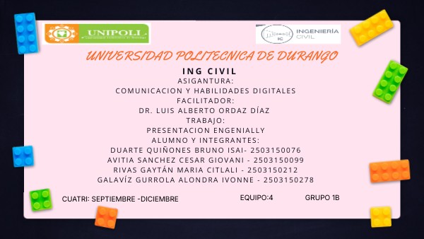 ASIGANTURA: COMUNICACION Y HABILIDADES DIGITALES FACILITADOR: DR. LUIS ALBERTO ORDAZ DÍAZ TRABAJO: PRESENTACION ENGENIALLY ALUMNO Y INTEGRANTES: DUARTE QUIÑONES BRUNO ISAI- 2503150076 AVITIA SANCHEZ CESAR GIOVANI - 2503150099 RIVAS GAYTÁN MARIA CITLALI - 2503150212 GALAVÍZ GURROLA ALONDRA IVONNE - 2503150278