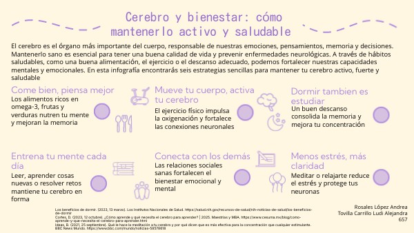 Los beneficios de dormir. (2023, 13 marzo). Los Institutos Nacionales de Salud. https://salud.nih.gov/recursos-de-salud/nih-noticias-de-salud/los-beneficios-de-dormir Cortes, D. (2023, 12 octubre). ¿Cómo aprende y qué necesita el cerebro para aprender? | 2025. Maestrías y MBA. https://www.cesuma.mx/blog/como-aprende-y-que-necesita-el-cerebro-para-aprender.html Ideas, B. (2021, 25 septiembre). Qué le hace la meditación a tu cerebro y por qué dicen que es más efectiva para la concentración que cualquier estimulante. BBC News Mundo. https://www.bbc.com/mundo/noticias-58578618