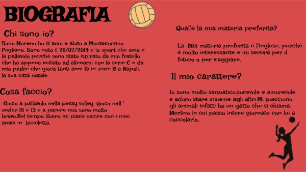 Sono Moreno ho 11 anni e abito a Montecorvino Pugliano. Sono nato il 25/07/2014 e lo sport che amo è la pallavolo perchè sono stato ispirato da mio fratello che ha appena iniziato ad allenarsi con la serie C e da mio padre che giocò tanti anni fa in serie B a Napoli, la sua città natale.