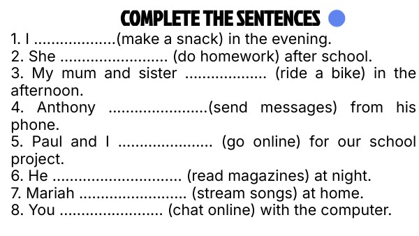1. I ...................(make a snack) in the evening. 2. She ......................... (do homework) after school. 3. My mum and sister ................... (ride a bike) in the afternoon. 4. Anthony .......................(send messages) from his phone. 5. Paul and I ...................... (go online) for our school project. 6. He .............................. (read magazines) at night. 7. Mariah ......................... (stream songs) at home. 8. You ........................ (chat online) with the computer.