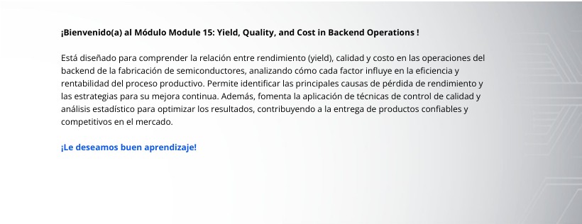 ¡Bienvenido(a) al Módulo Module 15: Yield, Quality, and Cost in Backend Operations ! Está diseñado para comprender la relación entre rendimi