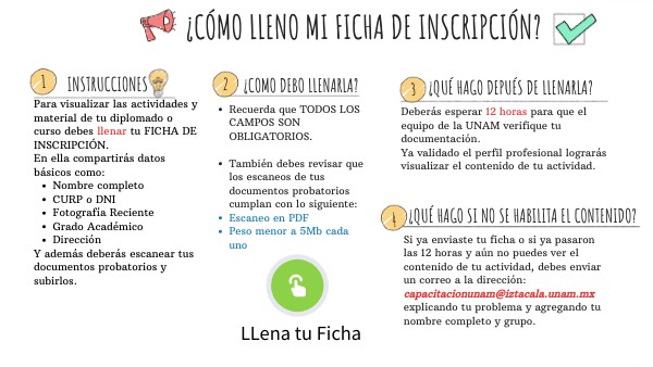 Si ya enviaste tu ficha o si ya pasaron las 12 horas y aún no puedes ver el contenido de tu actividad, debes enviar un correo a la dirección: capacitacionunam@iztacala.unam.mx explicando tu problema y agregando tu nombre completo y grupo.