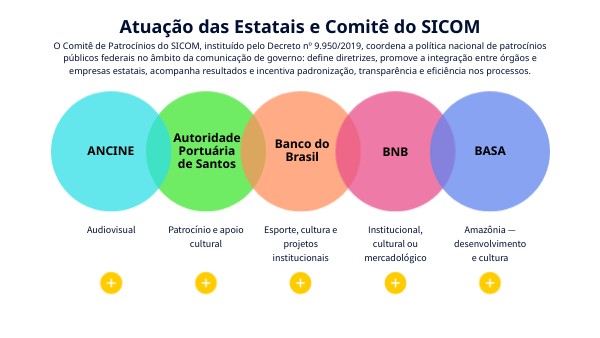 O Comitê de Patrocínios do SICOM, instituído pelo Decreto nº 9.950/2019, coordena a política nacional de patrocínios públicos federais no âmbito da comunicação de governo: define diretrizes, promove a integração entre órgãos e empresas estatais, acompanha resultados e incentiva padronização, transparência e eficiência nos processos.