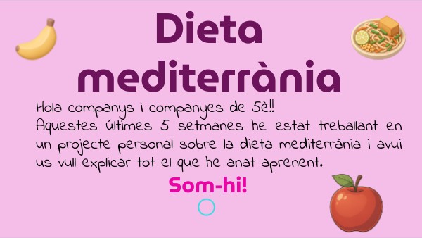 Hola companys i companyes de 5è!! Aquestes últimes 5 setmanes he estat treballant en un projecte personal sobre la dieta mediterrània i avui us vull explicar tot el que he anat aprenent.