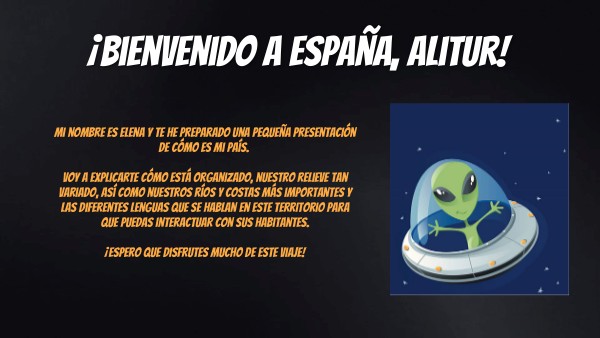 Mi nombre es Elena y te he preparado una pequeña presentación de cómo es mi país. Voy a explicarte cómo está organizado, nuestro relieve tan variado, así como nuestros ríos y costas más importantes y las diferentes lenguas que se hablan en este territorio para que puedas interactuar con sus habitantes. ¡Espero que disfrutes mucho de este viaje!
