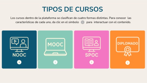 Los cursos dentro de la plataforma se clasifican de cuatro formas distintas. Para conocer las características de cada uno, da clic en el simbolo para interactuar con el contenido.