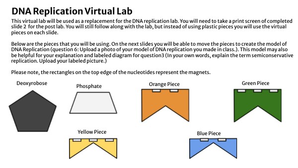 This virtual lab will be used as a replacement for the DNA replication lab. You will need to take a print screen of completed slide 2 for the post lab. You will still follow along with the lab, but instead of using plastic pieces you will use the virtual pieces on each slide. Below are the pieces that you will be using. On the next slides you will be able to move the pieces to create the model of DNA Replication (question 6: Upload a photo of your model of DNA replication you made in class.). This model may also be helpful for your explanation and labeled diagram for question3 (In your own words, explain the term semiconservative replication. Upload your labeled picture.) Please note, the rectangles on the top edge of the nucleotides represent the magnets.