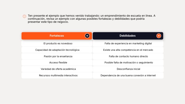 Ten presente el ejemplo que hemos venido trabajando: un emprendimiento de escuela en línea. A continuación, revisa un ejemplo con algunas posibles fortalezas y debilidades que podría presentar este tipo de negocio.