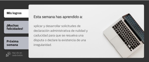 La próxima semana emprenderás un análisis en el que se explicará el desarrollo del Juicio de Nulidad y el Juicio de Amparo, a través de los cuales se dirimen disputas y se defienden o impugnan derechos de propiedad industrial.