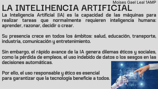 La Inteligencia Artificial (IA) es la capacidad de las máquinas para realizar tareas que normalmente requieren inteligencia humana: aprender, razonar, decidir o crear. Su presencia crece en todos los ámbitos: salud, educación, transporte, industria, comunicación y entretenimiento. Sin embargo, el rápido avance de la IA genera dilemas éticos y sociales, como la pérdida de empleos, el uso indebido de datos o los sesgos en las decisiones automáticas. Por ello, el uso responsable y ético es esencial para garantizar que la tecnología beneficie a todos.