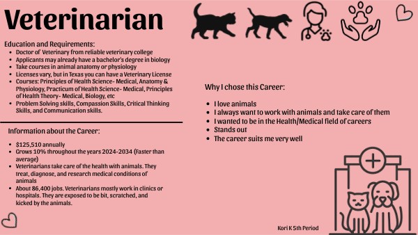 Veterinarians take care of the health with animals. They treat, diagnose, and research medical conditions of animals