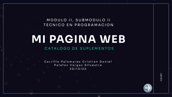 Mostrar catálogo inicial con 8 productos y opción de ver más.Proveer descripciones técnicas y orientadas al usuario sobre cada suplemento. Ofrecer navegación simple (Inicio / Nosotros / Contacto) y una página de detalle por producto. Presentar buen contraste y tema visual coherente para un público fitness. Estas son las funciones de mi pagina, el objetivo del proyecto es hacer una pagina de 0 con profesionalidad usando HTML, CSS y Java Script.