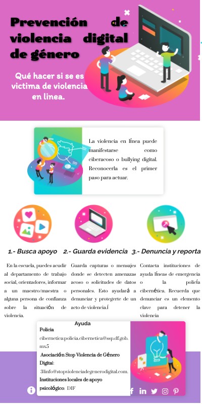 Policia cibernetica:policia.cibernetica@ssp.df.gob.mx5 Asociación Stop Violencia de Género Digital: 31info@stopviolenciadegenerodigital.com. Instituciones locales de apoyo psicológico: DIF