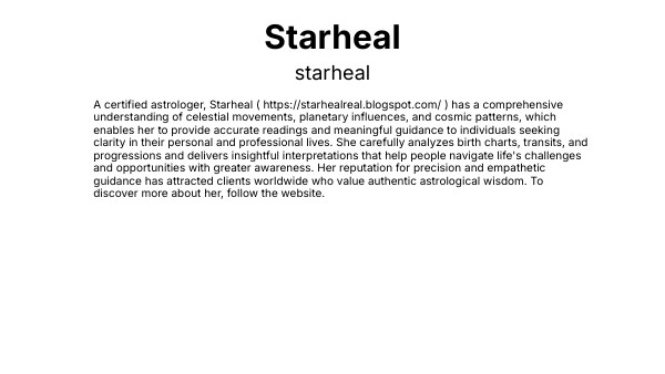 A certified astrologer, Starheal ( https://starhealreal.blogspot.com/ ) has a comprehensive understanding of celestial movements, planetary influences, and cosmic patterns, which enables her to provide accurate readings and meaningful guidance to individuals seeking clarity in their personal and professional lives. She carefully analyzes birth charts, transits, and progressions and delivers insightful interpretations that help people navigate life's challenges and opportunities with greater awareness. Her reputation for precision and empathetic guidance has attracted clients worldwide who value authentic astrological wisdom. To discover more about her, follow the website.