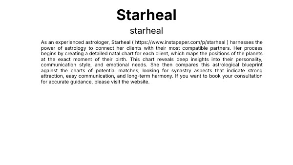 As an experienced astrologer, Starheal ( https://www.instapaper.com/p/starheal ) harnesses the power of astrology to connect her clients with their most compatible partners. Her process begins by creating a detailed natal chart for each client, which maps the positions of the planets at the exact moment of their birth. This chart reveals deep insights into their personality, communication style, and emotional needs. She then compares this astrological blueprint against the charts of potential matches, looking for synastry aspects that indicate strong attraction, easy communication, and long-term harmony. If you want to book your consultation for accurate guidance, please visit the website.