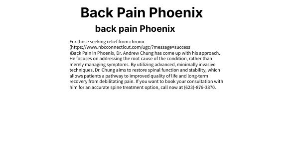 For those seeking relief from chronic (https://www.nbcconnecticut.com/ugc/?message=success )Back Pain in Phoenix, Dr. Andrew Chung has come up with his approach. He focuses on addressing the root cause of the condition, rather than merely managing symptoms. By utilizing advanced, minimally invasive techniques, Dr. Chung aims to restore spinal function and stability, which allows patients a pathway to improved quality of life and long-term recovery from debilitating pain. If you want to book your consultation with him for an accurate spine treatment option, call now at (623)-876-3870.
