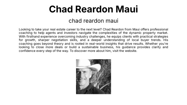 Looking to take your real estate career to the next level? Chad Reardon from Maui offers professional coaching to help agents and investors navigate the complexities of the dynamic property market. With firsthand experience overcoming industry challenges, he equips clients with practical strategies for growth, sharper negotiation skills, and a deeper understanding of local buyer trends. His coaching goes beyond theory and is rooted in real-world insights that drive results. Whether you're looking to close more deals or build a sustainable business, his guidance provides clarity and confidence every step of the way. To discover more about him, visit the website.