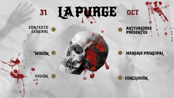 Violencia Se legaliza el asesinato durante una noche. Se normaliza la agresión como método de “purificación”.Desigualdad Los ricos se protegen, los pobres mueren. Denuncia la injusticia social. Hipocresía El gobierno justifica el mal en nombre del bien común. Critica la manipulación política. Egoísmo Las personas piensan solo en su supervivencia