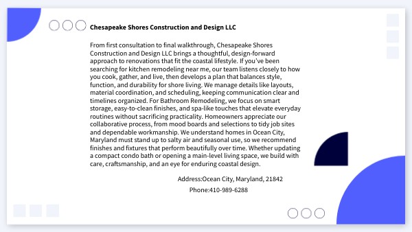 From first consultation to final walkthrough, Chesapeake Shores Construction and Design LLC brings a thoughtful, design-forward approach to renovations that fit the coastal lifestyle. If you’ve been searching for kitchen remodeling near me, our team listens closely to how you cook, gather, and live, then develops a plan that balances style, function, and durability for shore living. We manage details like layouts, material coordination, and scheduling, keeping communication clear and timelines organized. For Bathroom Remodeling, we focus on smart storage, easy-to-clean finishes, and spa-like touches that elevate everyday routines without sacrificing practicality. Homeowners appreciate our collaborative process, from mood boards and selections to tidy job sites and dependable workmanship. We understand homes in Ocean City, Maryland must stand up to salty air and seasonal use, so we recommend finishes and fixtures that perform beautifully over time. Whether updating a compact condo bath or opening a main-level living space, we build with care, craftsmanship, and an eye for enduring coastal design.