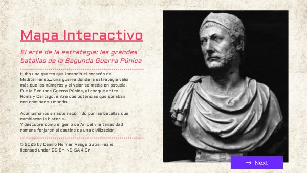 Recurso educativo digital que presenta un mapa interactivo del Mediterráneo antiguo, donde los estudiantes podrán explorar las principales batallas del conflicto (Tesino, Trebia, Trasimeno , Cannas, Metauro, Ilipa y Zama). Cada marcador mostrará información breve, imágenes y mapas tácticos permitien