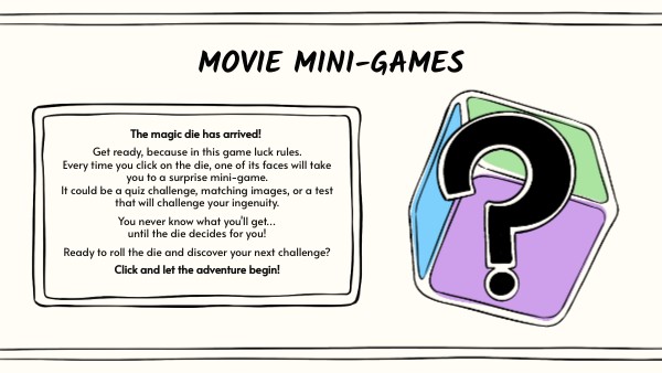 The magic die has arrived! Get ready, because in this game luck rules.Every time you click on the die, one of its faces will take you to a surprise mini-game.It could be a quiz challenge, matching images, or a test that will challenge your ingenuity. You never know what you'll getโฆuntil the die decides for you! Ready to roll the die and discover your next challenge? Click and let the adventure begin!