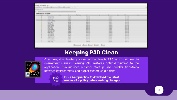 Over time, downloaded policies accumulate in PAD which can lead to intermittent issues. Cleaning PAD restores optimal function to the application. This includes a faster start-up time, quicker transitions between entry screens, and proper system shut downs.