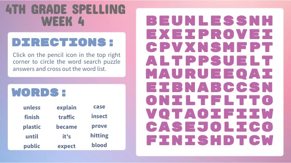 Click on the pencil icon in the top right corner to circle the word search puzzle answers and cross out the word list.