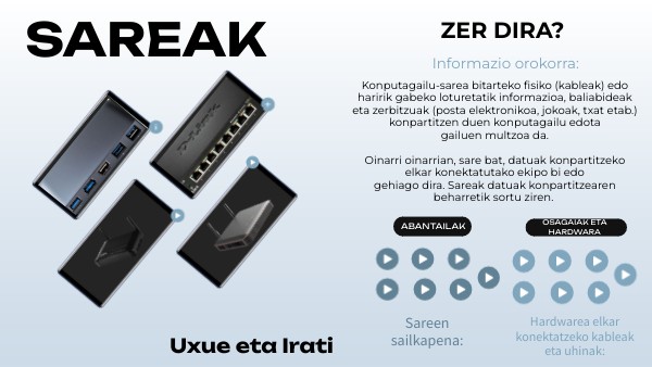 Hub, switch, zubiak, router (Ordenagailuak elkar konektatzeko gailua) UPS (etenik gabeko elikadura) Sare baliabideak: sare-inprimagailua, biltegiratze periferikoak (RAID)