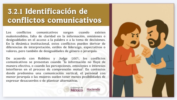 Los conflictos comunicativos surgen cuando existen malentendidos, falta de claridad en la información, omisiones o desigualdades en el acceso a la palabra o a la toma de decisiones. En la dinámica institucional, estos conflictos pueden derivar de diferencias de interpretación, estilos de liderazgo, expectativas o valores, pero también de desigualdades de género o jerarquía. De acuerdo con Robbins y Judge (2017), los conflictos comunicativos se presentan cuando “la información no fluye de manera efectiva, o cuando las percepciones, emociones o intereses interfieren en el proceso de comprensión mutua”. En contextos donde predomina una comunicación vertical, el personal con menor jerarquía o las mujeres suelen tener menos posibilidades de expresar desacuerdos o de plantear alternativas.