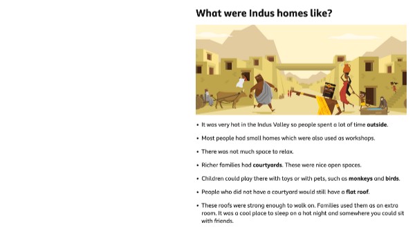 Children in the Indus Valley seem to have loved toys. Archaeologists have found lots of clay toys, such as model carts and animals. They have also found model cows that waggle their heads, and toy monkeys that could slide down ropes. Indus children may have played with pull-along animals on wheels like the one in this photo.