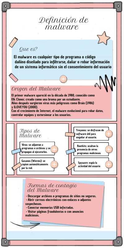 El primer malware apareció en la década de 1980, conocido como Elk Cloner, creado como una broma por un estudiante.Años después surgieron virus más peligrosos como Brain (1986) y ILOVEYOU (2000). Con el crecimiento de Internet, el malware evolucionó para robar datos, controlar equipos y extorsionar a los usuarios.
