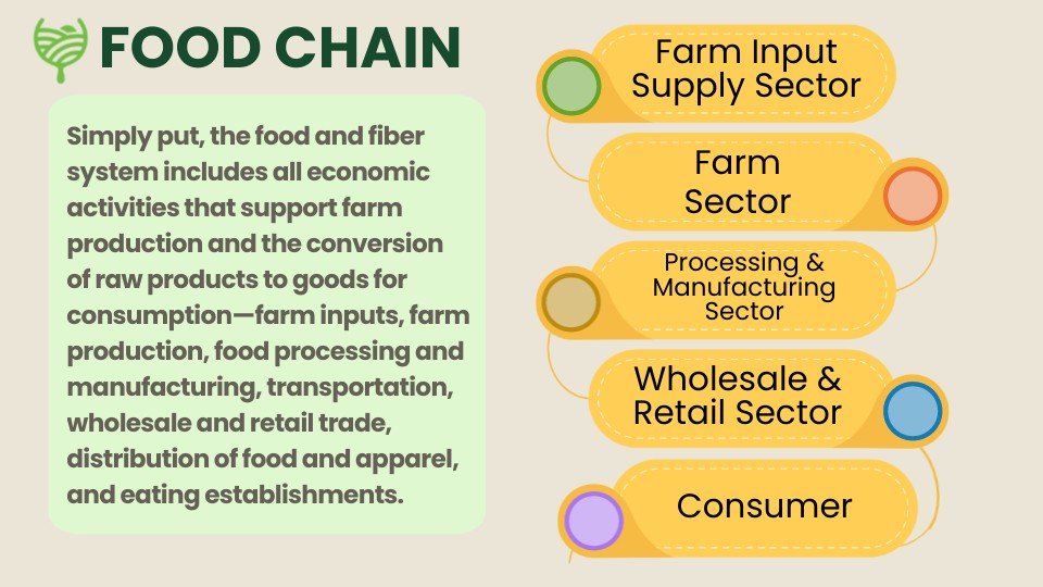 Simply put, the food and fiber system includes all economic activities that support farm production and the conversion of raw products to goods for consumption—farm inputs, farm production, food processing and manufacturing, transportation, wholesale and retail trade, distribution of food and apparel, and eating establishments.