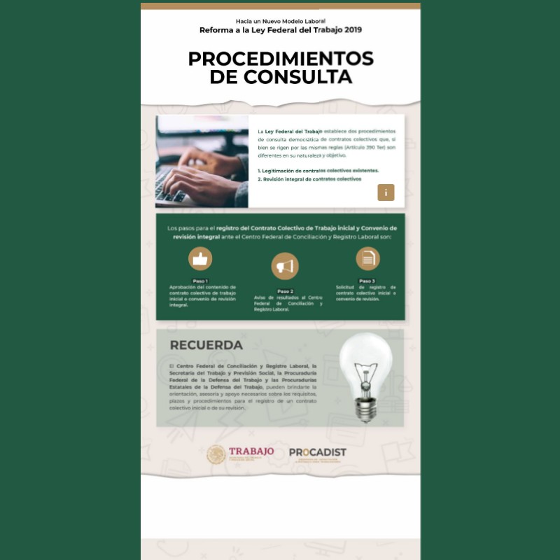1. AVISO.Una vez acordados con el patrón los términos del contrato inicial o del convenio de revisión, el sindicato dará aviso al Centro Federal de Conciliación y Registro Laboral (CFCRL) que someterá a consulta la aprobación del acuerdo. 2. CARACTERÍSTICAS. La convocatoria debe emitirse al menos diez días antes de la fecha de la consulta y publicarse en lugares visibles. Además, señalará el día, hora y lugar de la consulta. Importante: El sindicato deberá entregar a los trabajadores un ejemplar impreso o electrónico del contrato inicial o del convenio de revisión que se someterá a consulta. 3. CONSULTA. El lugar designado para la votación deberá ser accesible y permitir que la emisión del voto sea libre, pacífica, ágil y segura. 4. RESULTADOS. El resultado de la votación será publicado por la directiva sindical en lugares visibles del centro o centros de trabajo.
