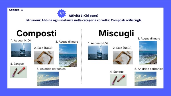 Attività 1: Chi sono? Istruzioni: Abbina ogni sostanza nella categoria corretta: Composti o Miscugli.