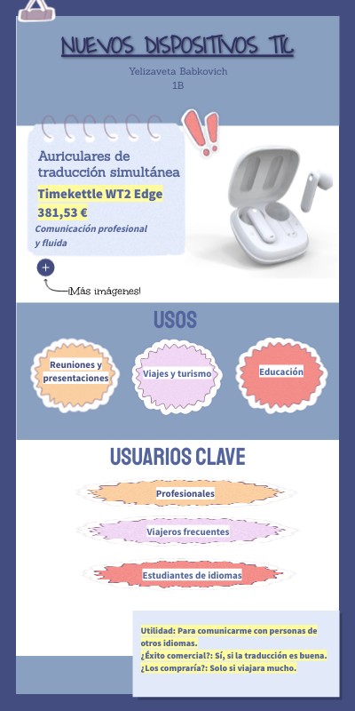 Utilidad: Para comunicarme con personas de otros idiomas. ¿Éxito comercial?: Sí, si la traducción es buena. ¿Los compraría?: Solo si viajara mucho.