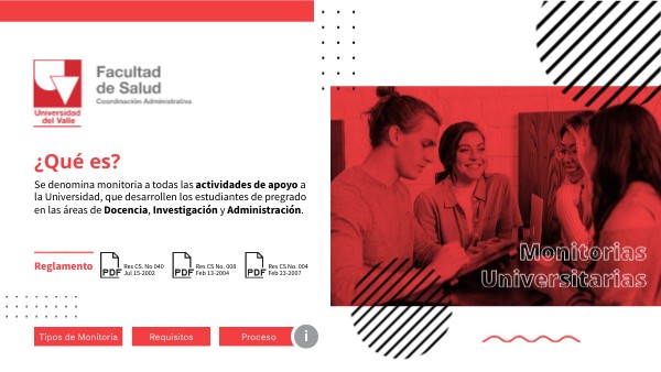 Se denomina monitoria a todas las actividades de apoyo a la Universidad, que desarrollen los estudiantes de pregrado en las áreas de Docencia, Investigación у Administración.