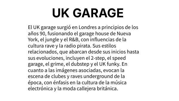 El UK garage surgió en Londres a principios de los años 90, fusionando el garage house de Nueva York, el jungle y el R&B, con influencias de la cultura rave y la radio pirata. Sus estilos relacionados, que abarcan desde sus inicios hasta sus evoluciones, incluyen el 2-step, el speed garage, el grime, el dubstep y el UK funky. En cuanto a las imágenes asociadas, evocan la escena de clubes y raves underground de la época, con énfasis en la cultura de la música electrónica y la moda callejera británica.