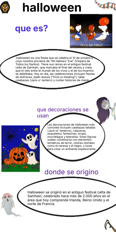 .Halloween es una fiesta que se celebra el 31 de octubre y cuyo nombre proviene de "All Hallows' Eve" (Víspera de Todos los Santos). Tiene sus raíces en el antiguo festival celta de Samhain, que marcaba el final del verano y creía que el velo entre el mundo de los vivos y el de los muertos se debilitaba. Hoy en día, las celebraciones incluyen fiestas de disfraces, pedir dulces ("trick-or-treating"), tallar calabazas (Jack-o'-lantern) y contar historias de miedo.