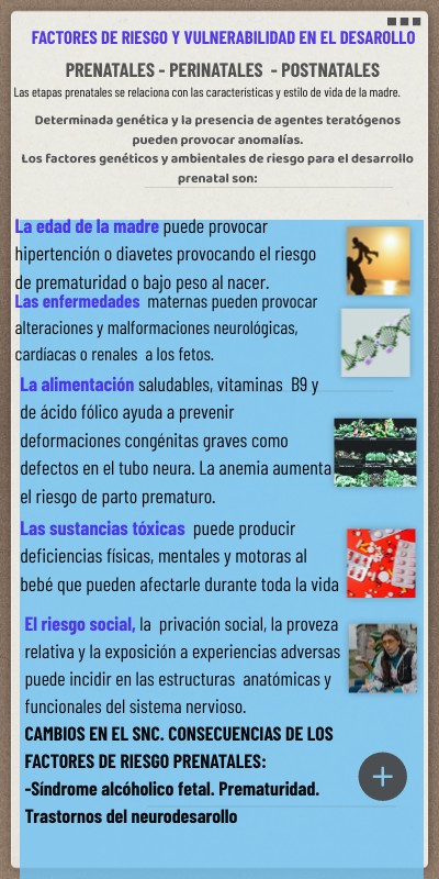 El riesgo social, la privación social, la proveza relativa y la exposición a experiencias adversas puede incidir en las estructuras anatómicas y funcionales del sistema nervioso.CAMBIOS EN EL SNC. CONSECUENCIAS DE LOS FACTORES DE RIESGO PRENATALES: -Síndrome alcóholico fetal. Prematuridad. Trastornos del neurodesarollo